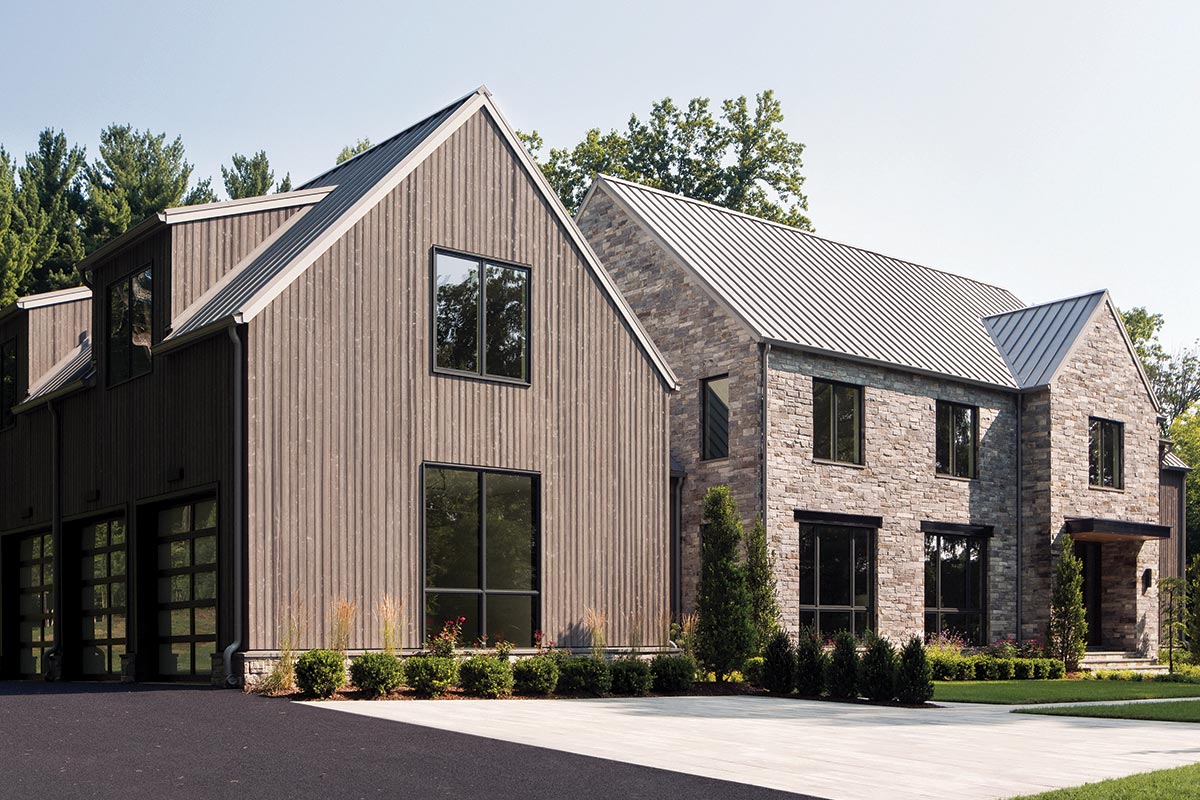 This new custom home blends contemporary style with timeless rural utilitarian-inspired traditional elements, designed to meet the client’s vision for a space that feels both authentic and modern. Defined by simple geometric forms, the architecture features intersecting gables accented with sleek steel C-channels, creating a visually dynamic silhouette. Oversized windows and extensive glass usher in natural light, offering indoor/outdoor connections that perfectly complement the home’s wooded setting.