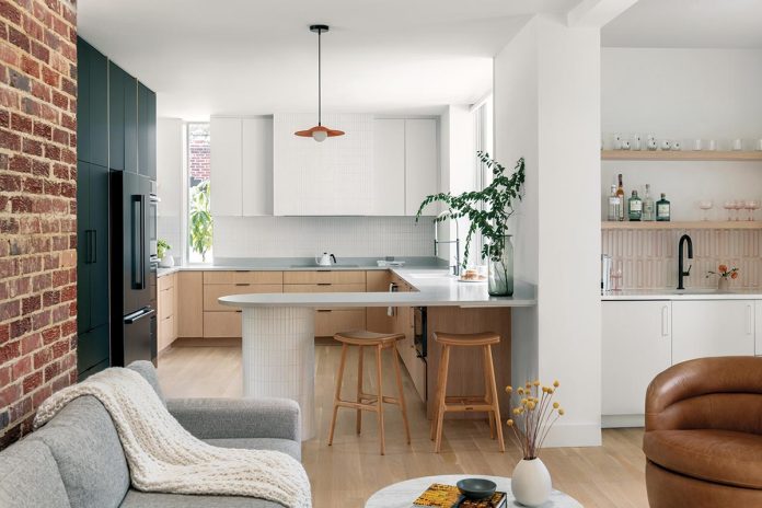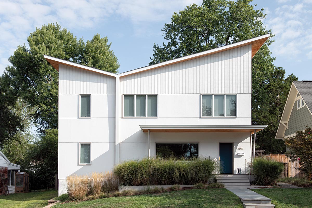 Originally 1,200 square feet, the home was expanded with a second floor beneath a distinctive butterfly roof, doubling its size to a modest 2,400 square feet. The result is a refined balance of efficiency, intimacy and connection—an elegant transformation within a restrained footprint.