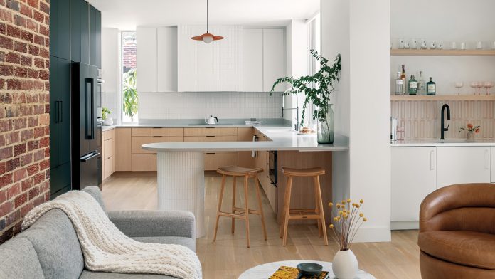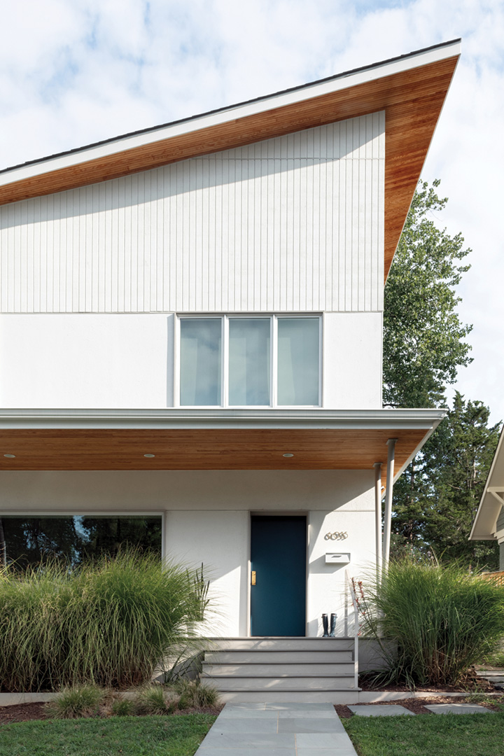 Originally 1,200 square feet, the home was expanded with a second floor beneath a distinctive butterfly roof, doubling its size to a modest 2,400 square feet. The result is a refined balance of efficiency, intimacy and connection—an elegant transformation within a restrained footprint.