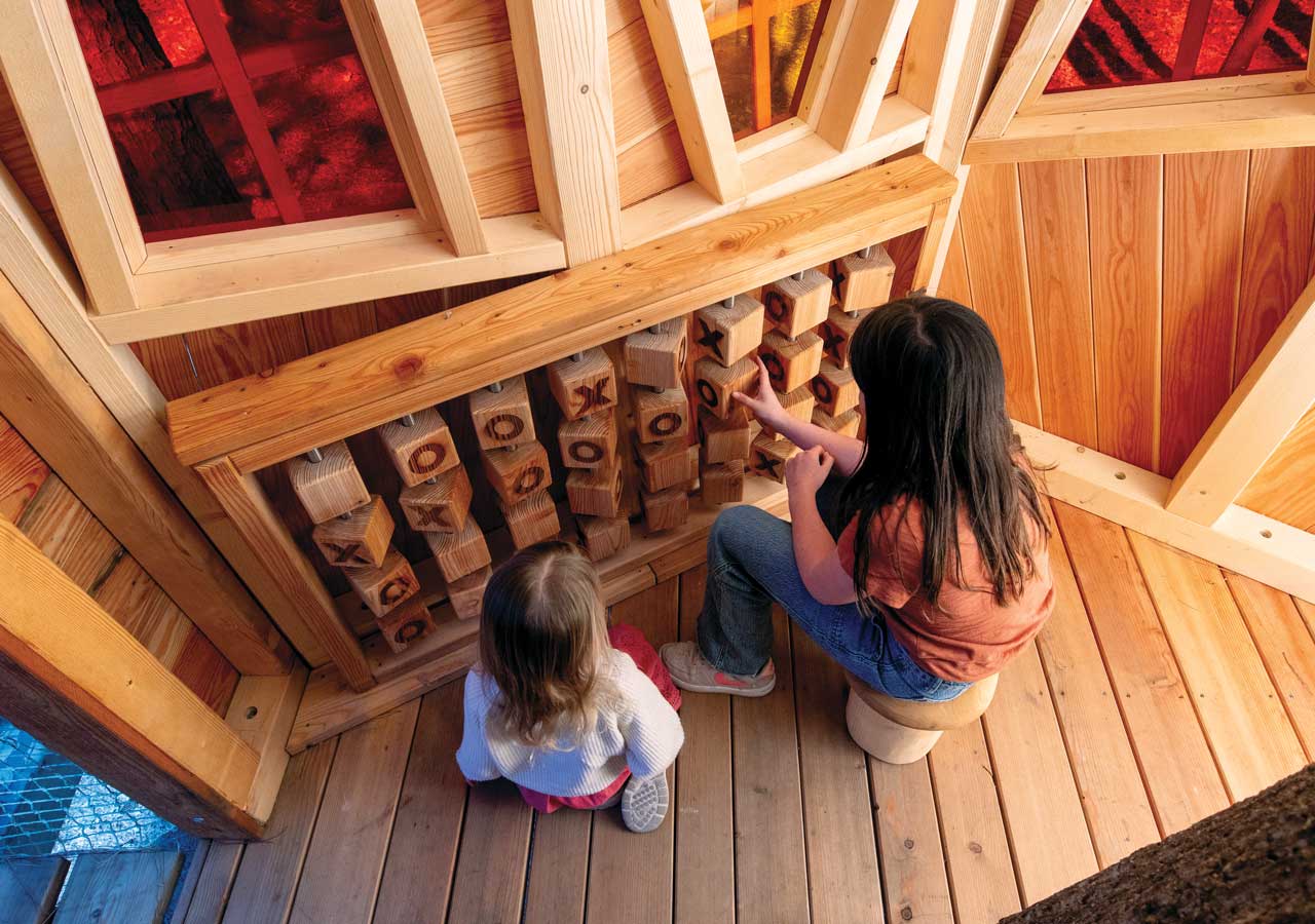 Inspired by parks in Switzerland, Austria and Germany, Owl Creek Landing is also home to four whimsical treehouses with unique elements ranging from a tic-tac-toe game created in spinning wood blocks, to geometric windows, mushroom-shaped stools and a playful music box.Â